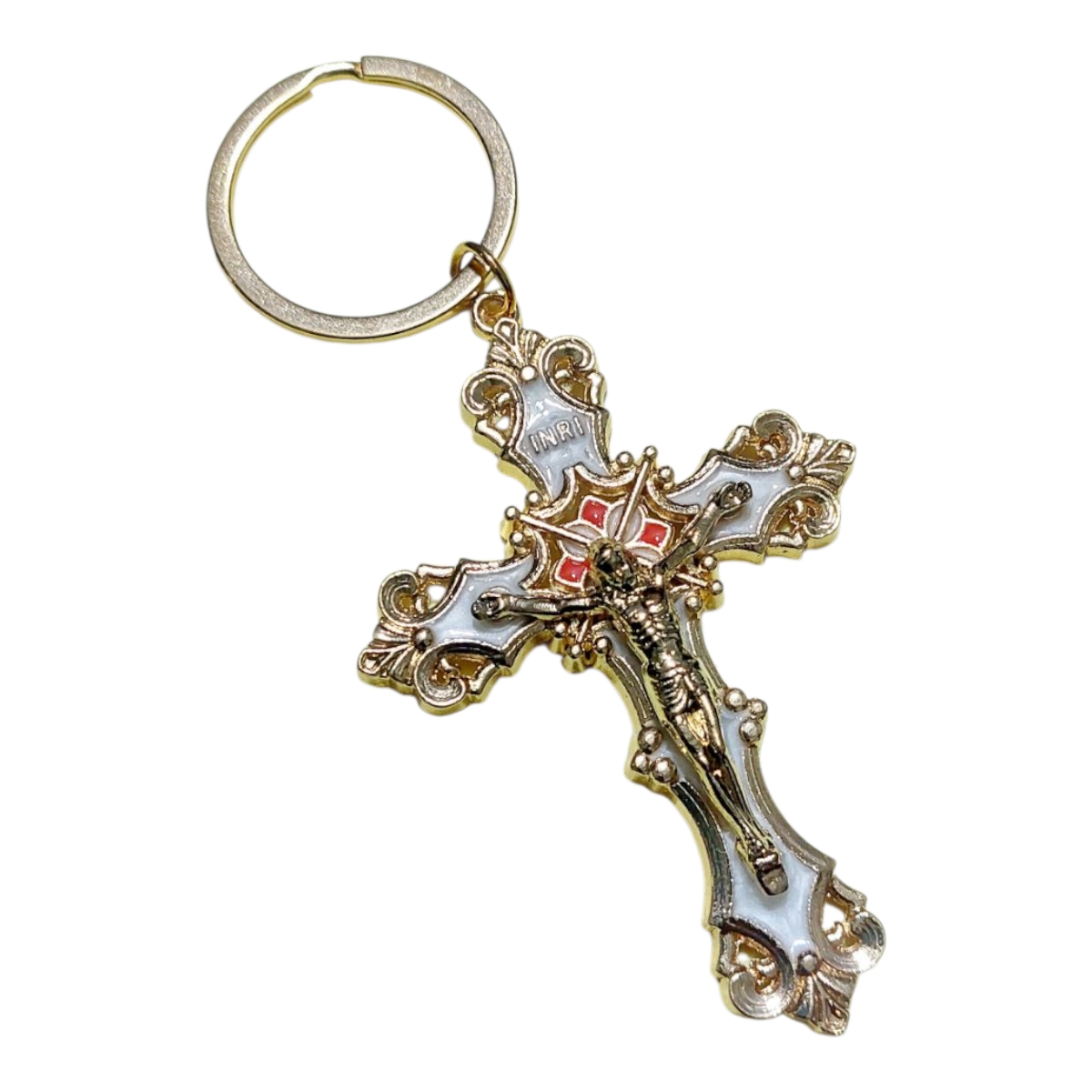 CHAVEIRO CRUZ SÃO BENTO DOURADO BRANCO RELIGIOSO CRUCIFIXO
