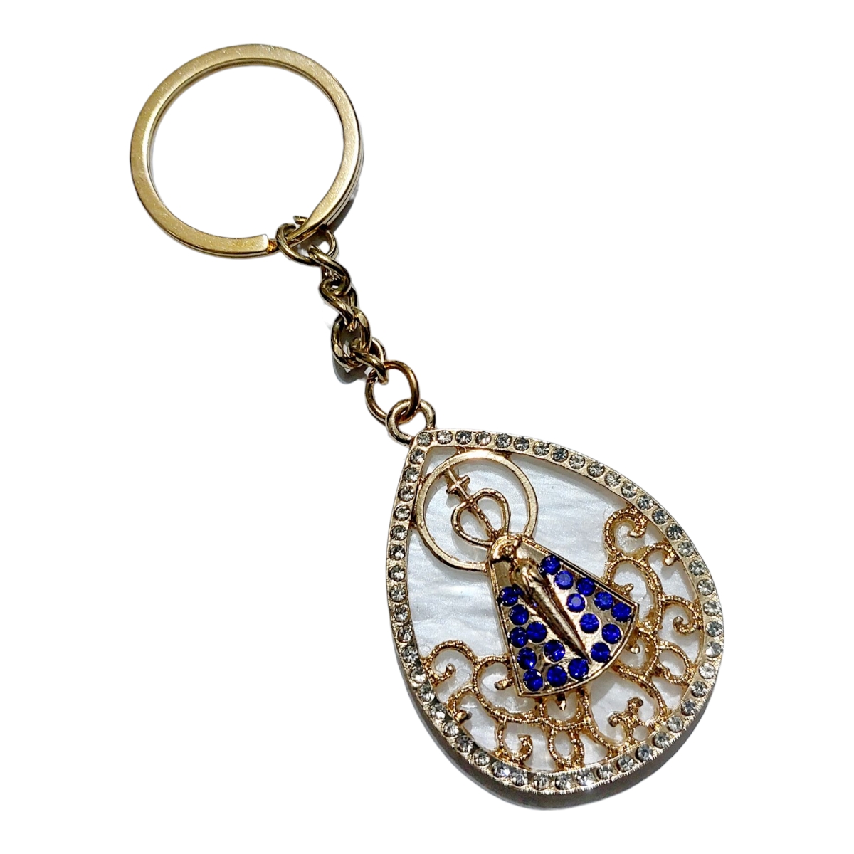 CHAVEIRO DOURADO CAPA PEDRAS AZUIS APARECIDA fundo perolado