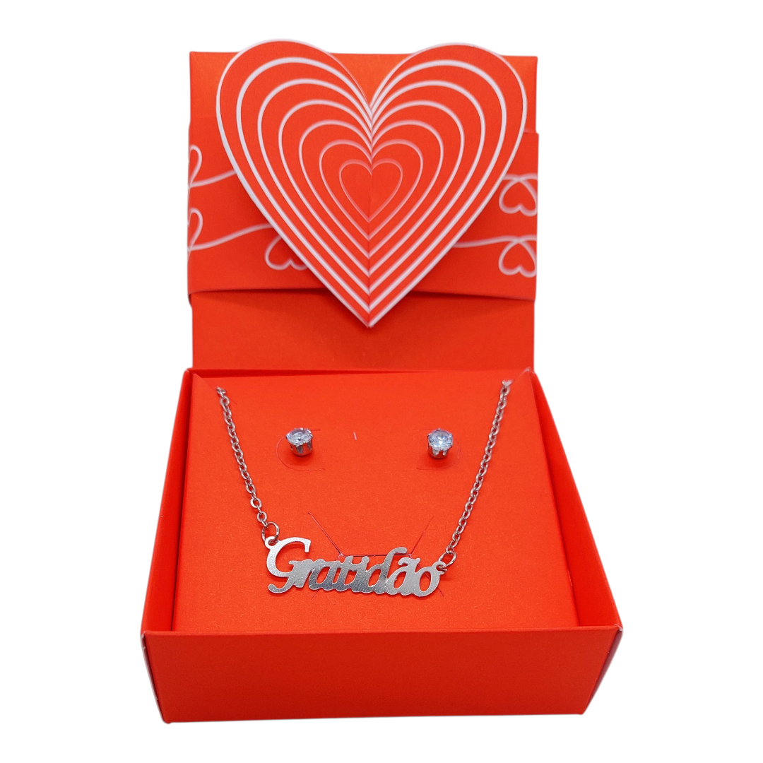 Colar + brinco + caixa presente AÇO INOX PINGENTE GRATIDÃO