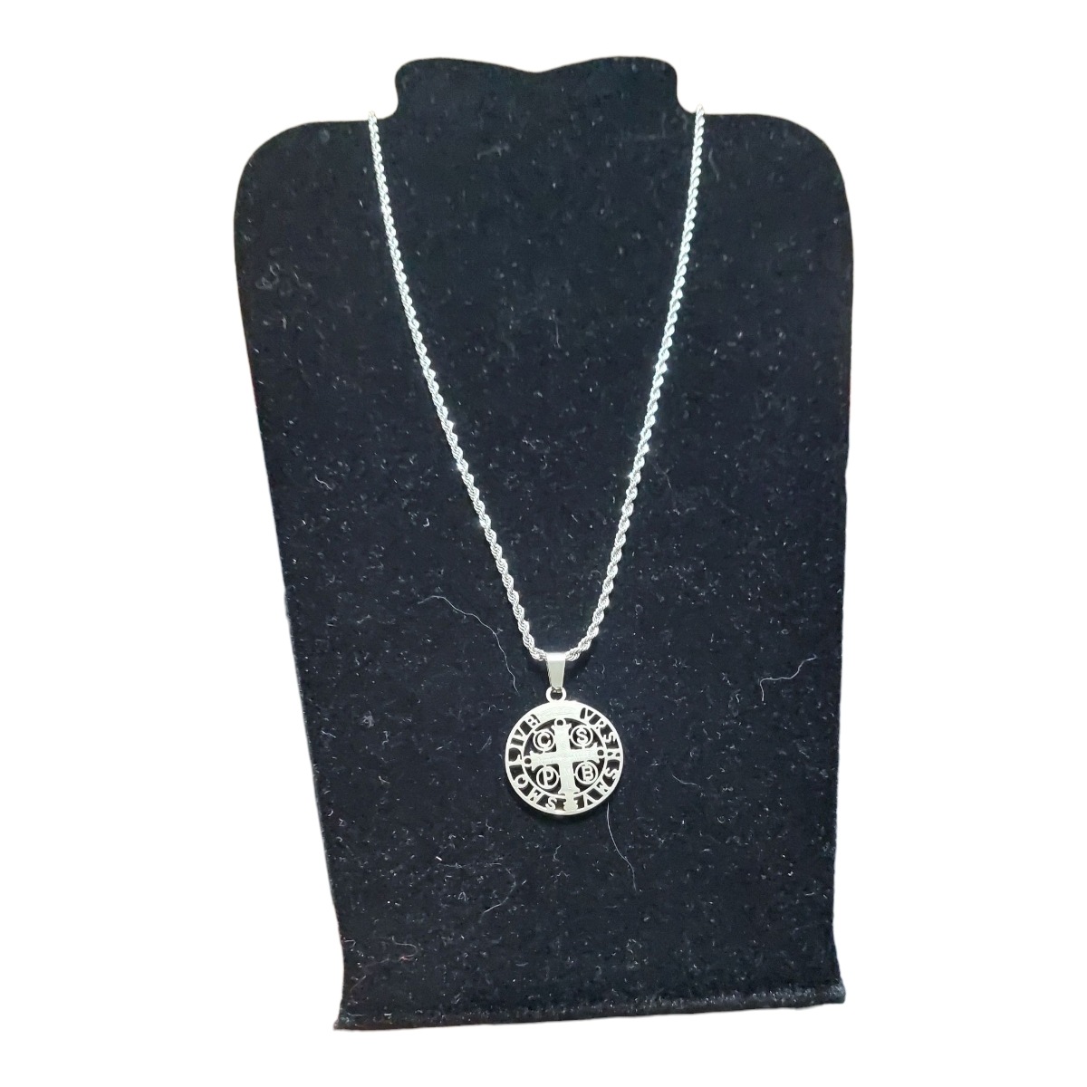Pingente medalha de São Bento vazado em aço inox prateado,