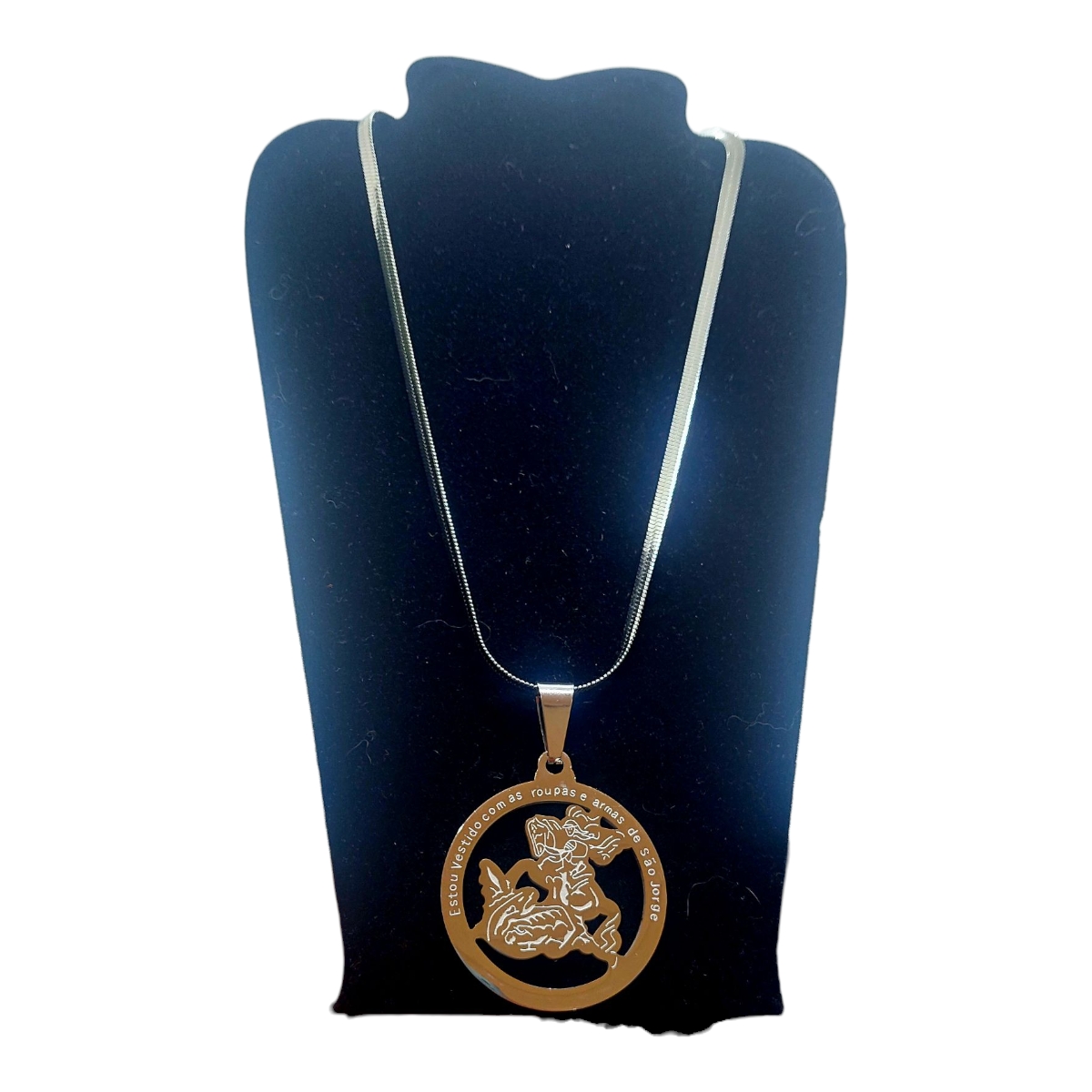Este grande pingente prateado em aço inoxidável destaca SãoJorge dentro de um design circular, mostrando poder espiritual e proteção.