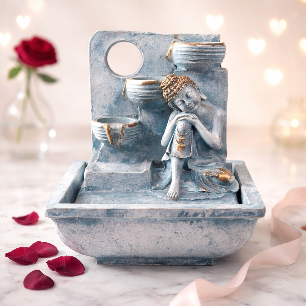 Fonte resina Buda Pensador Turquesa 18cm 3 quedas bivot