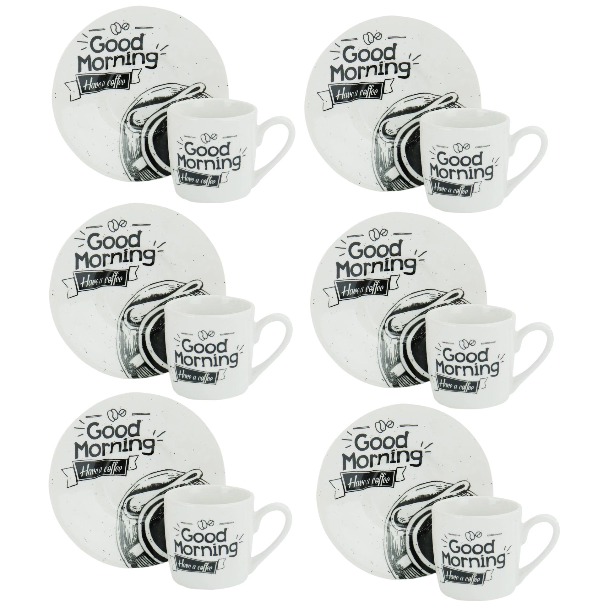 - Jogo composto de 6 xícaras de porcelana e 6 pires em porcelana, material de alta qualidade e requinte, com estampa de frases; - Medidas aprox.; xícara (7,5x5,5cm); pires (11,5x11,5cm);