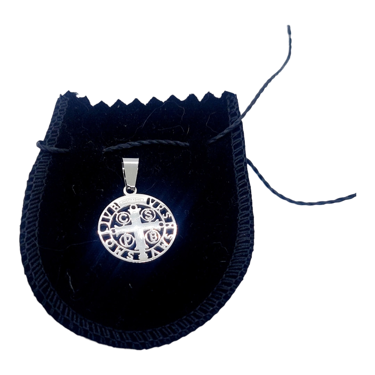 Pingente medalha de São Bento vazado em aço inox prateado,