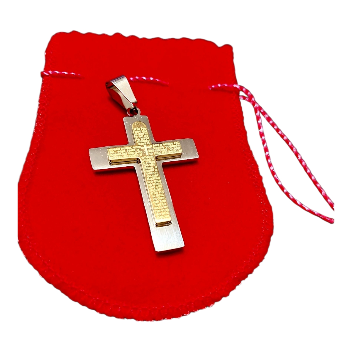 PINGENTE AÇO INOX PRATA CRUZ RELEVO DOURADO ORAÇÃO RELIGIOSO
