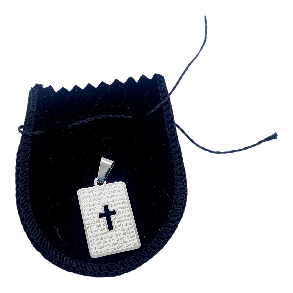 O Pingente Prateado Oração Pai Nosso com Cruz Vazada é uma peça compacta e