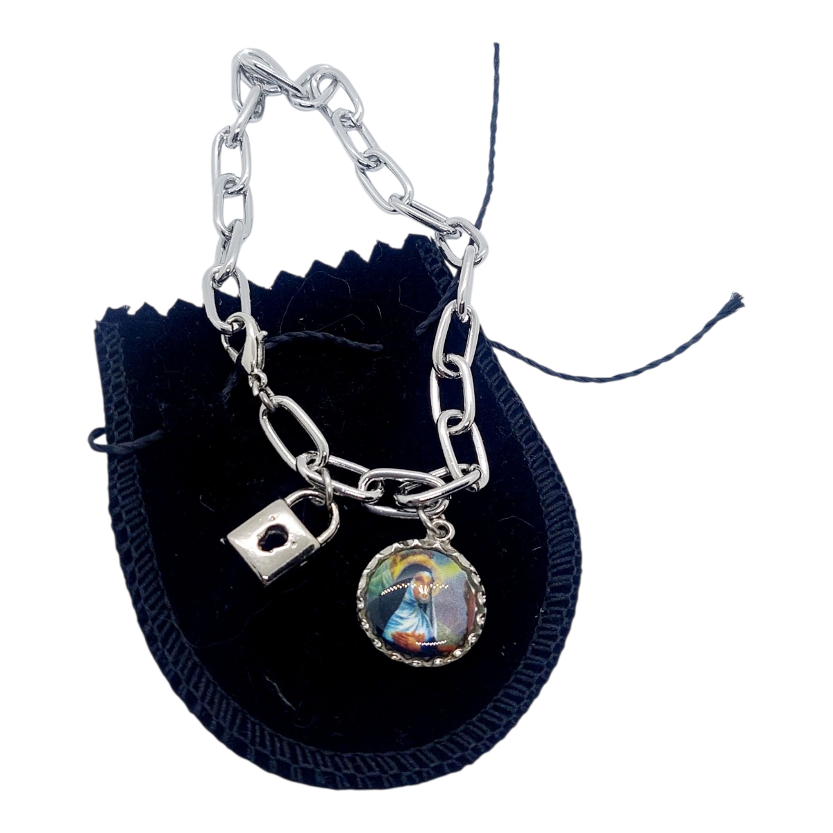 Pulseira em aço inox prateado com elos ovais, medalha de santa rita de cassia e pingente de cadeado , 22cm.Cor: PrateadoMaterial: Aço inoxidávelComprimento: 22cm