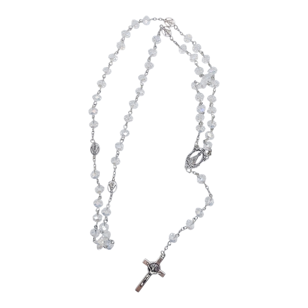TERÇO NOSSA SENHORA APARECIDA CRISTAL branco metal 50cmx 8mm