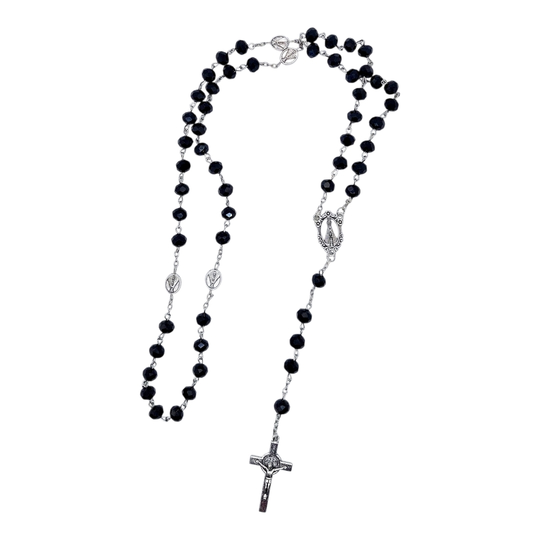 TERÇO NOSSA SENHORA APARECIDA CRISTAL preto metal 50cm x 8mm