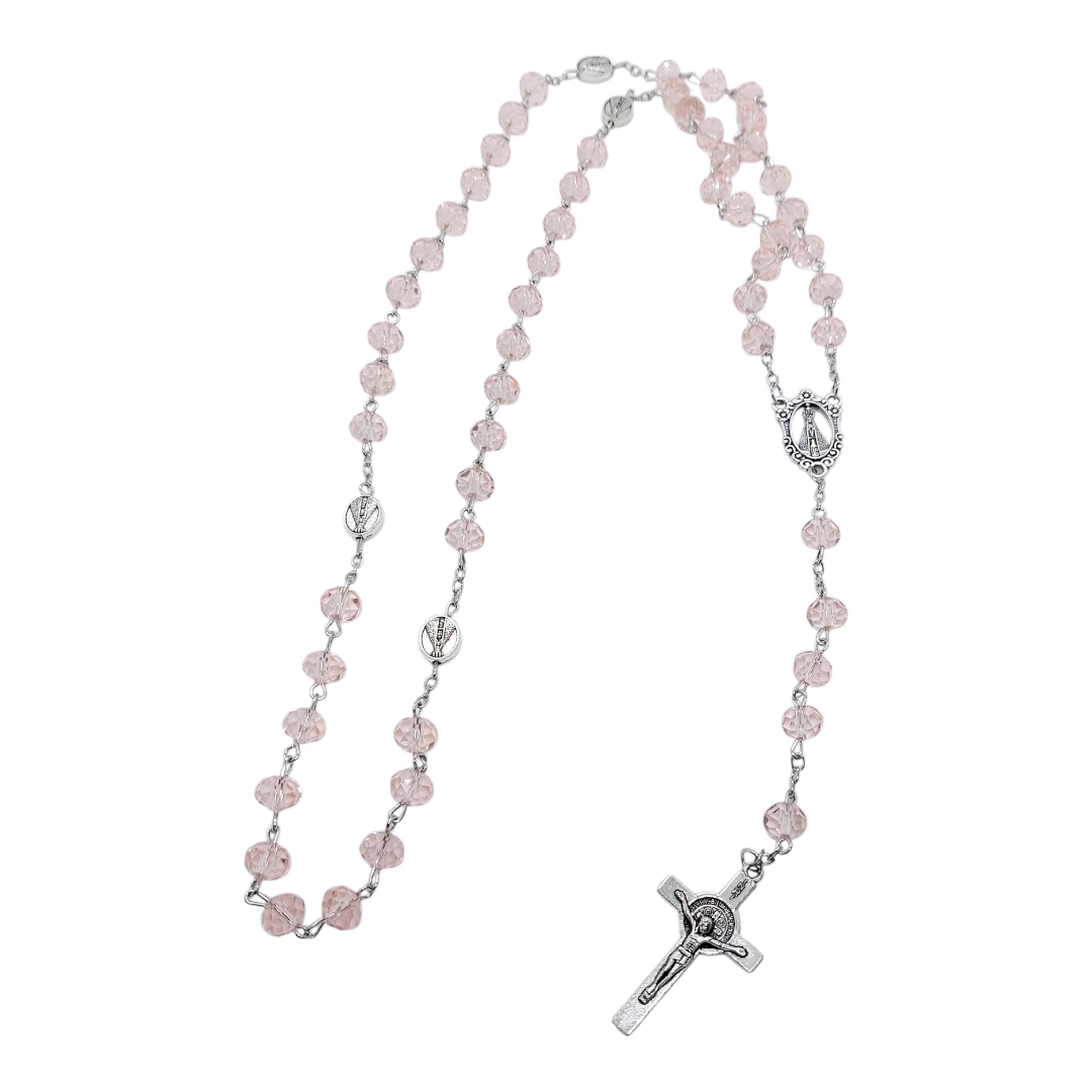 TERÇO NOSSA SENHORA APARECIDA CRISTAL rosa metal 50cm x 8mm